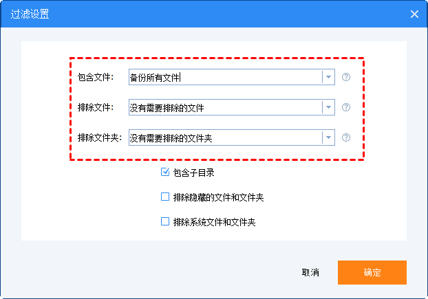 • 包含文件:该选项框可以指定需要备份文件的格式。支持通配符并用分号分隔多个掩码 (如*.doc;*.xls;*.ppt)。