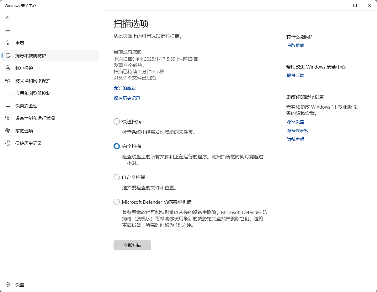 3. 选择 全面扫描,然后点击 “立即扫描” 开始扫描。