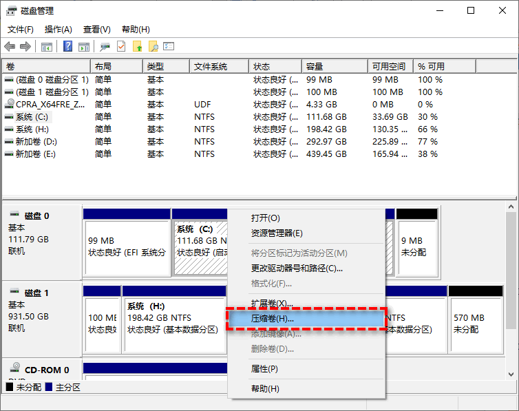 步骤2. 右键点击您电脑磁盘上任意一个有空闲空间的磁盘,选择“压缩卷”。