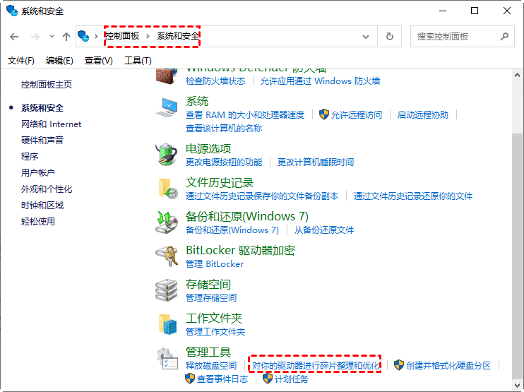 2. 单击“系统和安全”,然后在“管理工具”下,选择“对你的驱动器进行碎片整理和优化”。