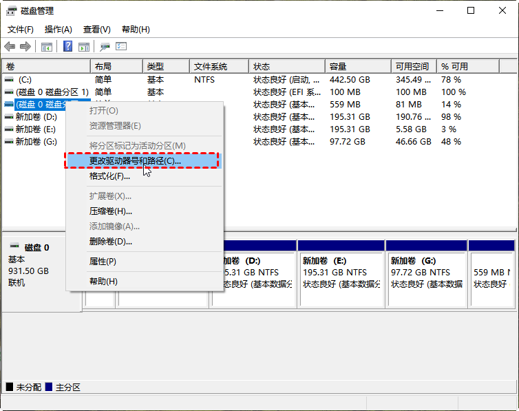 2. 在“磁盘管理”窗口中,右键单击需要删除盘符的驱动器,选择“更改盘符和路径”。