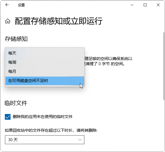3. 打开存储感知并从运行存储感知的下拉菜单中的每天、每周、每月、可用磁盘空间不足时中选择合适的选项。