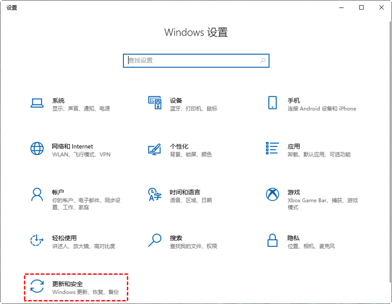 步骤1. 右键单击左下角Windows图标,选择“设置”,单击“更新和安全”。