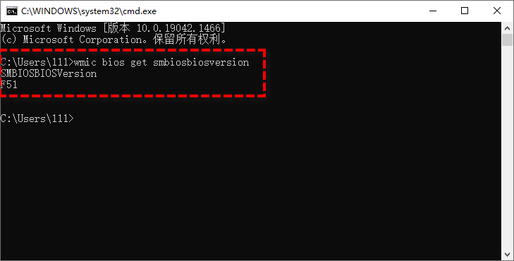 打开命令提示符,输入wmic bios get smbiosbiosversion,然后按回车键,屏幕上会显示出当前BIOS版本。