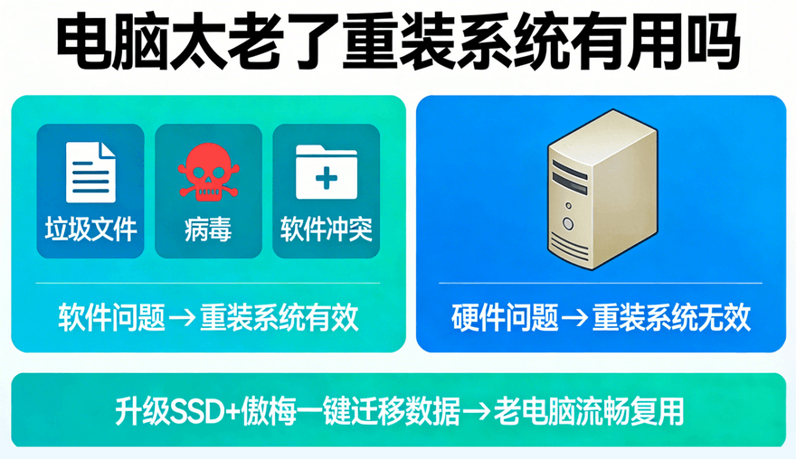 电脑太老了重装系统有用吗?答案分情况而定!软件层面(垃圾、病毒、软件冲突)卡顿,重装有效;硬件层面卡顿则无效。推荐高性价比焕新方案:升级SSD,搭配傲梅轻松备份一键迁移数据,让老电脑流畅如新。