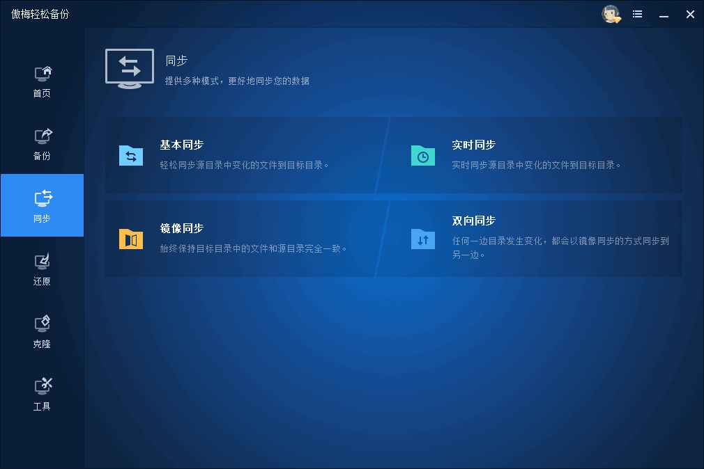 作为一款专业的局域网文件传输软件,傲梅轻松备份的同步功能并非单一传输,而是提供4种灵活的同步模式,覆盖个人、企业等各类局域网场景,无论是简单的文件拷贝,还是复杂的多设备同步,都能精准适配,满足不同用户的个性化需求。