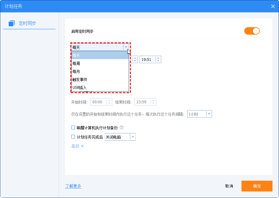 此外,若想要设置计划任务让同步过程可以自动进行,你可以点击“定时同步”功能选择,然后选择一种自动同步的方式,包括每天、每周、每月、触发事件,USB插入,让您时刻拥有新文件。后两个选择是VIP功能