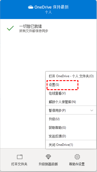步骤1. 右键单击任务栏中的OneDrive图标,然后在菜单中选择“设置”。