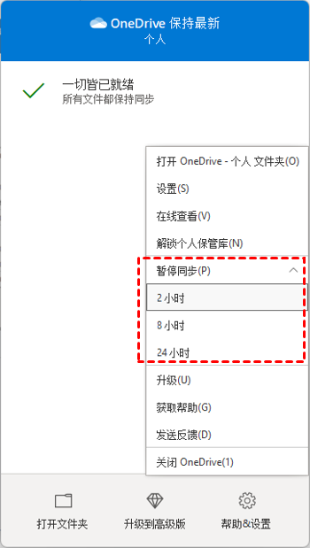 步骤1. 右键单击底部任务栏中的OneDrive图标,然后单击“暂停同步”的下拉菜单。然后选择“2小时”。