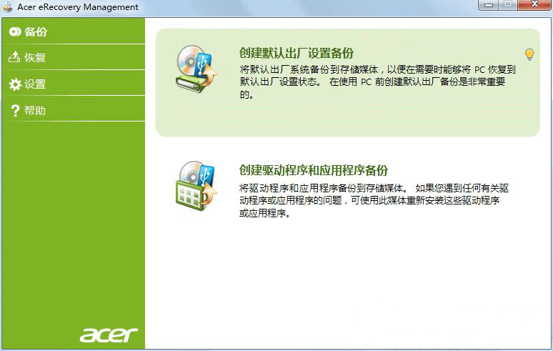 2. 对于宏碁Aspire计算机,有一个内置程序可系统备份和恢复出厂设置。您可以登录到Windows或在启动期间按特定键来重置电脑。