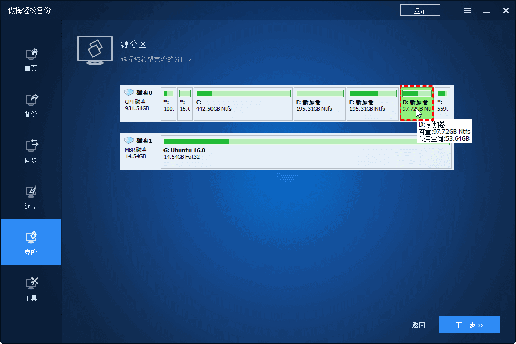 步骤2. 选择需要迁移的数据所在分区作为克隆的源分区,然后点击“下一步”。