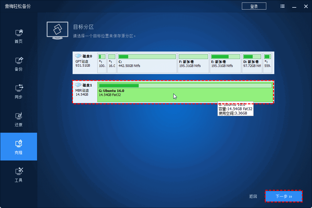 步骤3. 选择新电脑所在硬盘中的一个分区作为克隆的目标分区,当然,您也可以根据需要将分区克隆到同一硬盘中的其他分区。点击“下一步”。