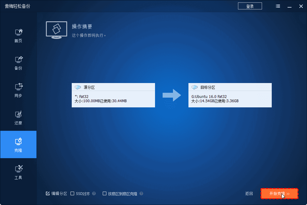 步骤4. 左下角有3个选择,有需要可以进行设置,若没有则点击“开始克隆”启动任务。