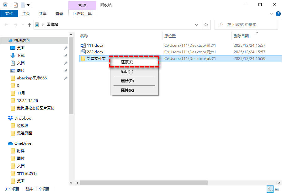 注意:若回收站已被清空,或文件夹是通过Shift+Delete组合键删除的,此方法无效,需尝试后续方法。
