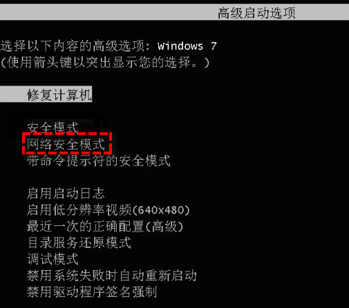 步骤2. 等待高级启动界面出现之后,点击“网络安全模式”选项即可成功进入能够联网的安全模式。