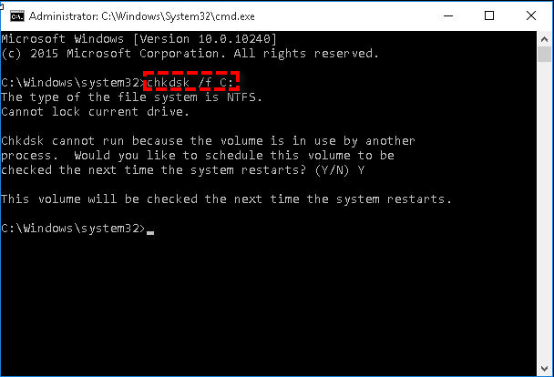 2. 在“cmd”中输入“chkdsk /f C:”后按下“回车”。