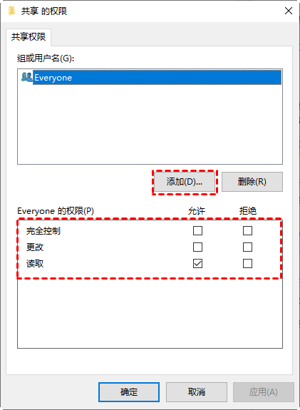 步骤4. 点击“添加”您要与之共享的用户,只要输入用户对象名称并点击“确定”。然后,为之前添加的用户设置权限,您可以选择“完全控制”、“更改”或“读取”。