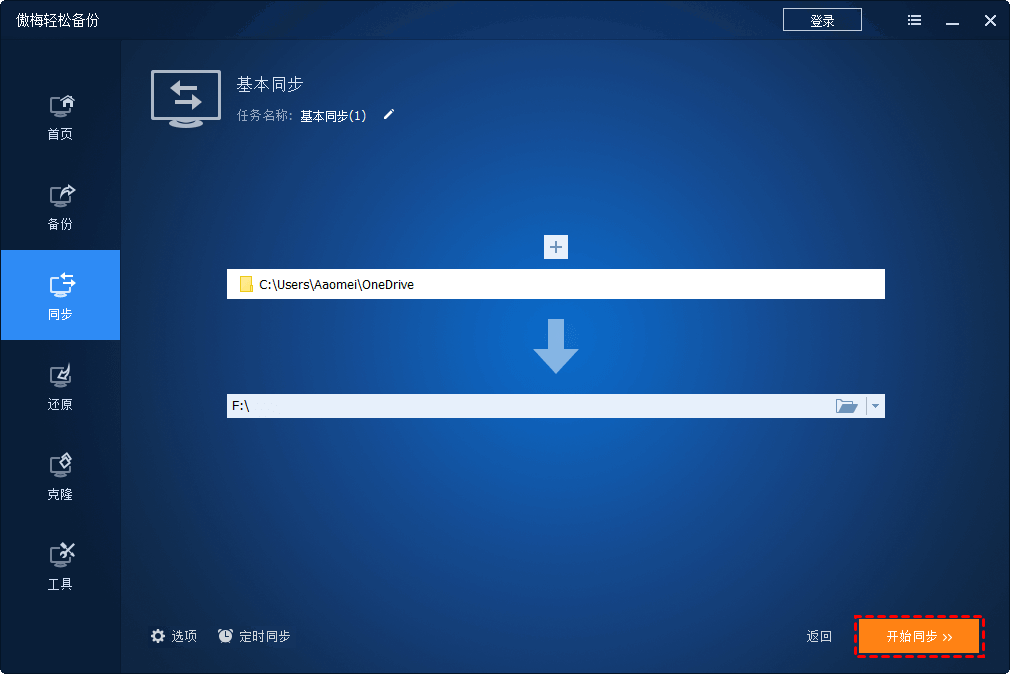如前所述,默认文件夹位置不适合您的数据保护是OneDrive如何自动同步文件到外置硬盘?使用傲梅轻松备份可以轻松的帮助您。使用它,您可以同步OneDrive文件到任意位置保留文件的副本。然后,如果您的计算机出现问题,您还可以使用外部硬盘中的副本。