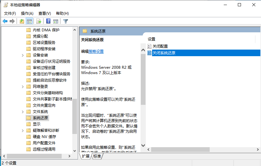 3. 双击关闭系统还原,选择未配置或已禁用,然后点击应用和确定。