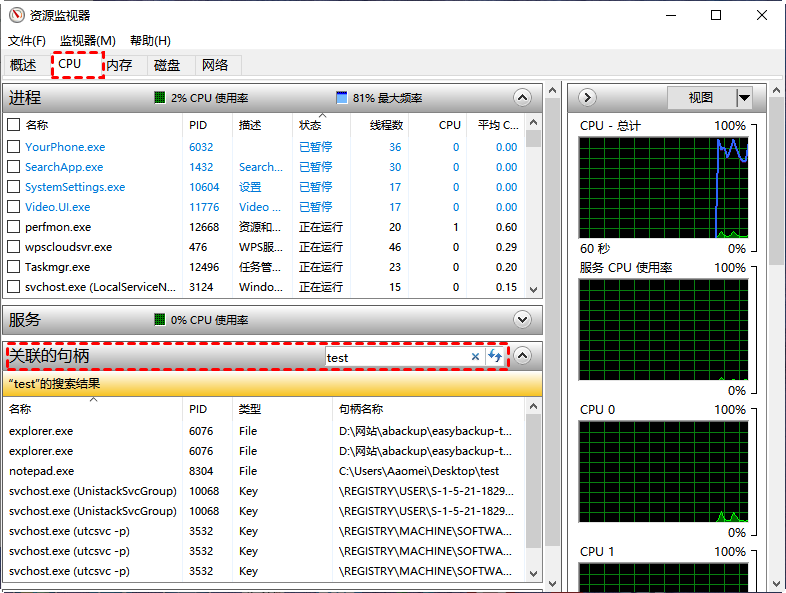 3. 在“CPU”界面“关联的句柄”处搜索待删除文件或文件夹的名字,也可以是绝对路径。然后,在下方会列出相关联的搜索结果。