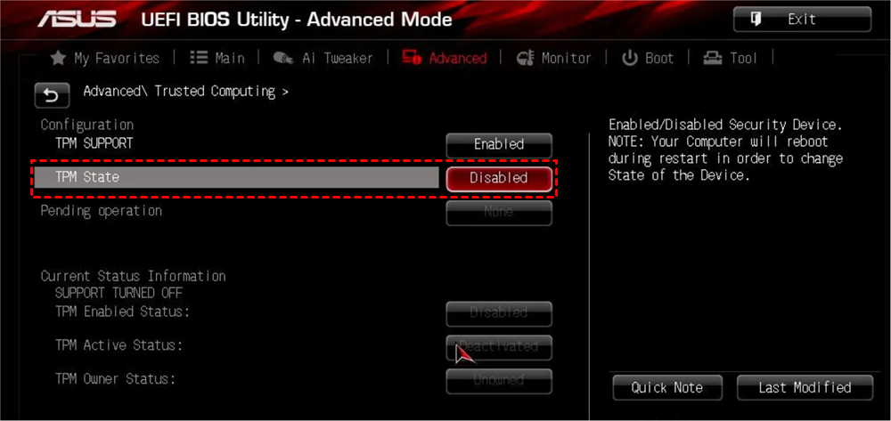 注意:如果要重新启动TPM,只需按照相同的步骤切换到启用选项即可。