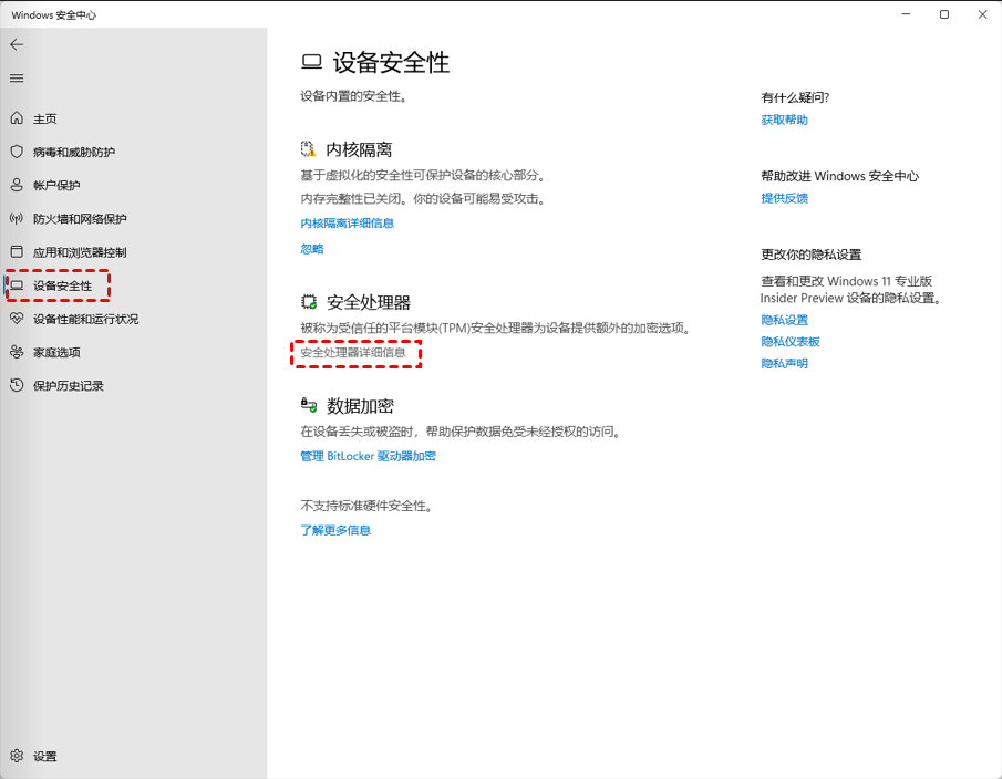 3. 切换到“设备安全”,然后单击“安全处理器详细信息”。