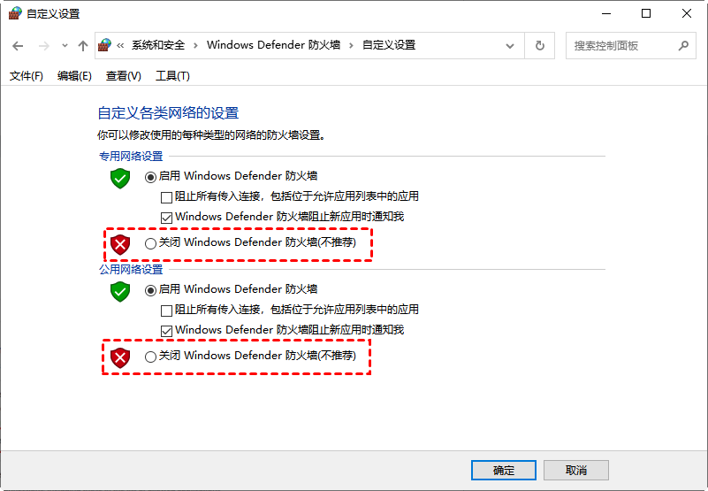 5. 在专用网络设置和公共网络设置部分,选择“关闭Windows Defender防火墙(不推荐)”,然后单击“确定”按钮保存更改。