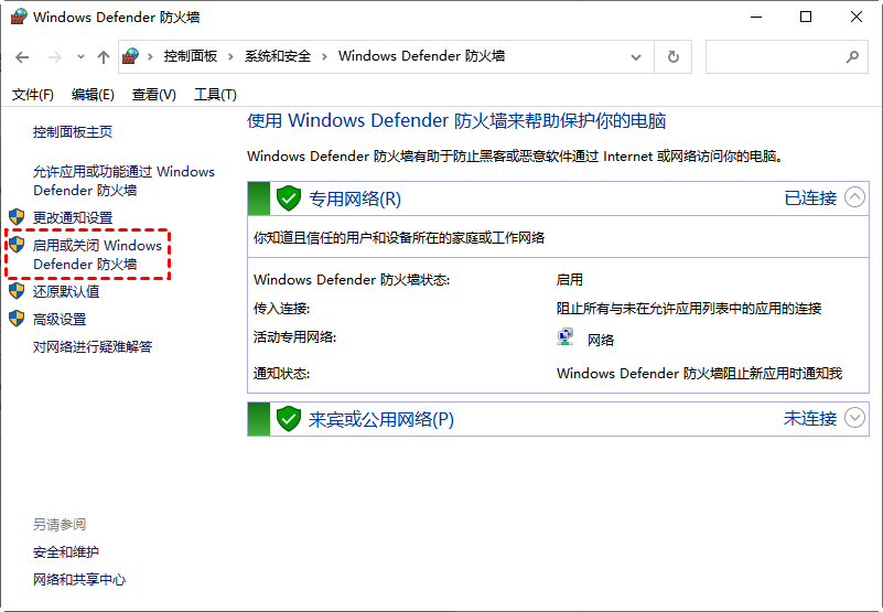4. 在左侧菜单中,找到并单击“打开或关闭Windows Defender防火墙”。