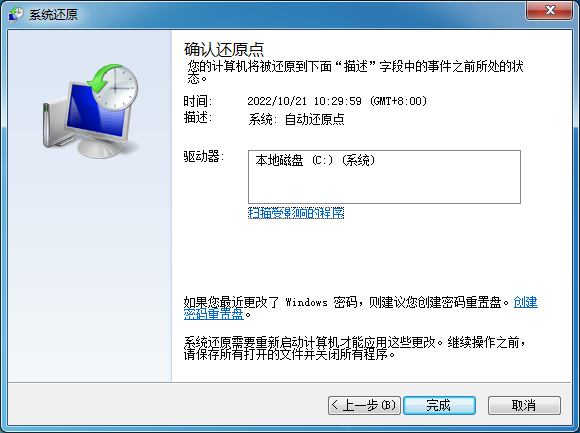 步骤4. 确认Win7系统还原的操作摘要没有问题后点击“完成”启动还原过程。