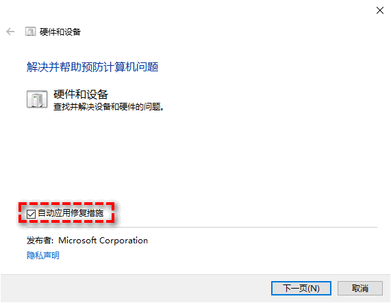 步骤1. 按Win+R输入msdt.exe -id DeviceDiagnostic并按Enter键打开硬件和设备检查窗口。
