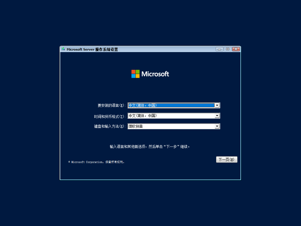步骤1. 在Microsoft操作系统设置界面中设置安装的语言和时间货币等,然后点击“下一页”。