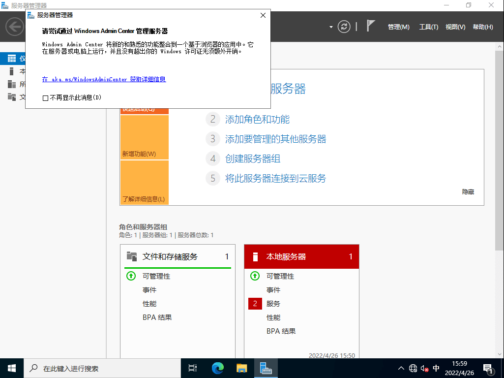 至此,Windows server 2022安装过程就已完成,剩下的就是根据需求部署服务器了。细心的小伙伴可能会发现,在这个过程中没有像安装Window10或Windows11一样让输入产品密钥。难道服务器版本让大家免费使用吗?