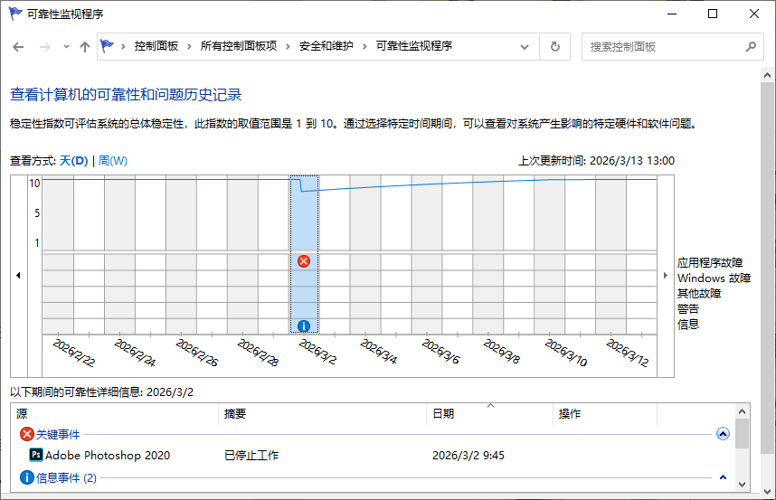 如果觉得事件查看器操作稍复杂,可使用可靠性监视器,它以时间线形式展示系统稳定性,能直观看到崩溃发生的时间和具体事件,是Windows查看崩溃日志的简化版方法,无需筛选,一目了然。