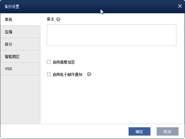 ◉ 设置:您可以在这里管理备份加密、电子邮件通知、压缩级别、镜像拆分,并选择智能扇区或完整扇区备份。