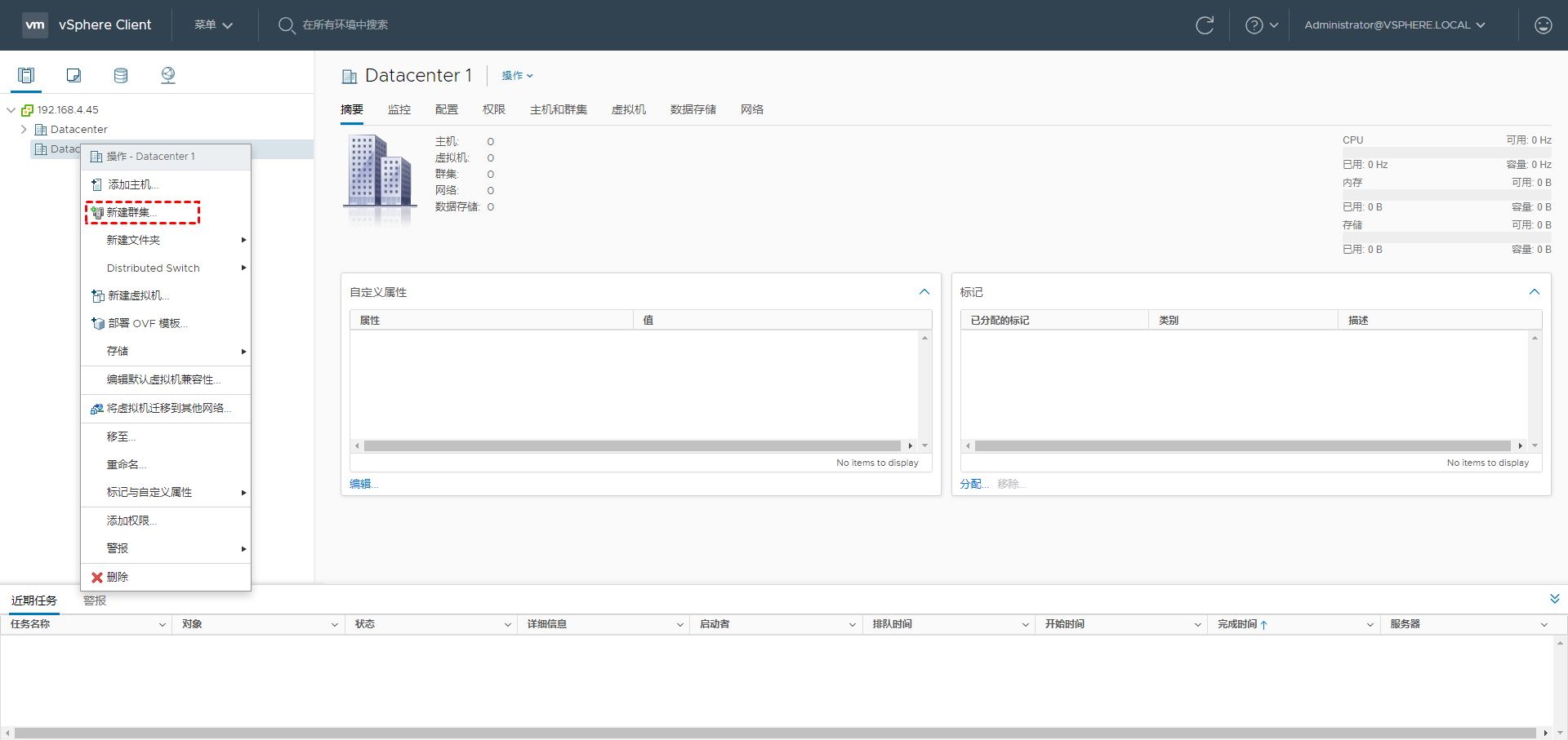 4. 右键单击 数据中心 并选择 新建集群...