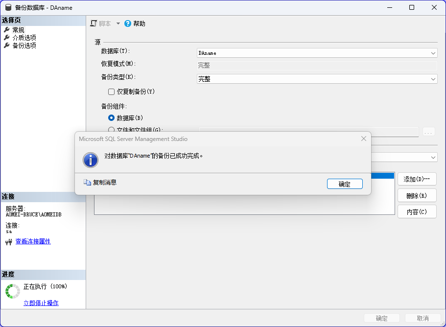 4. 数据库备份任务设置完成后点击“确定”启动备份。