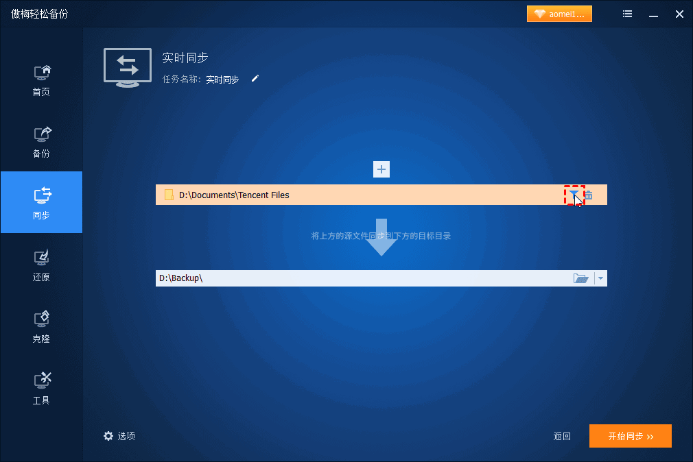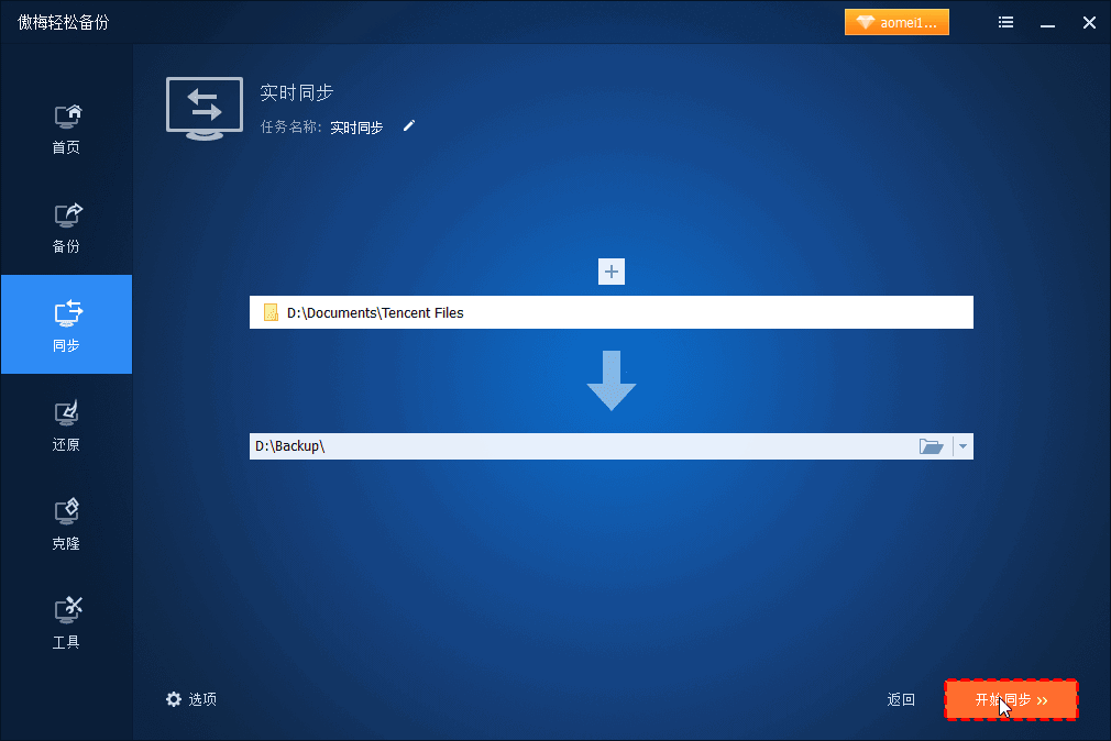 步骤1 :安装并启动傲梅企业备份标准版。单击 同步 > 实时同步 。