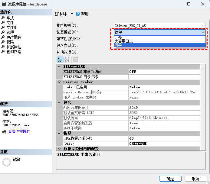 5. 当前恢复模式 SQL Server 将在恢复模式 列表框中 可见 。