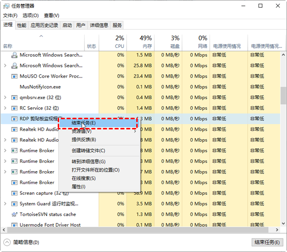 步骤2. 转到“进程”选项卡查找是否有进程rdpclip.exe,名字也是不同的,也有系统叫“RDP剪贴板监视程序”,右键单击该项目并选择“结束任务”,然后再右键此选项选择“启动”。