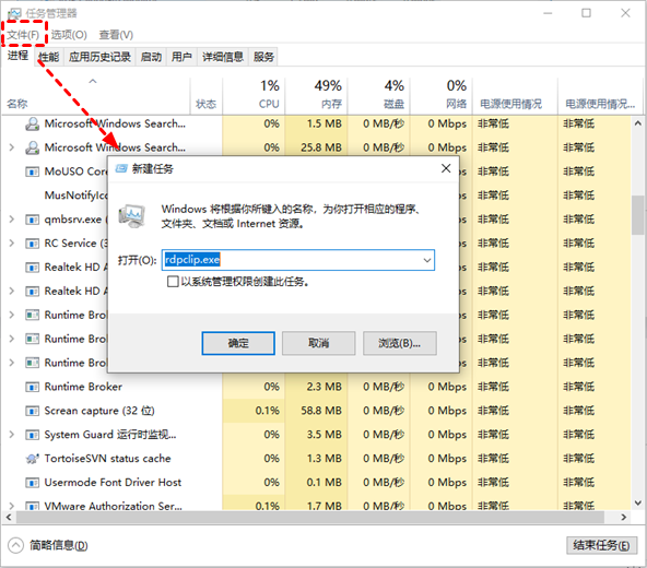 注意:如果没有该进程,则单击任务管理器左上角的文件,选择“创建新任务”。然后在弹出的窗口中输入“rdpclip.exe”,点击“确定”。