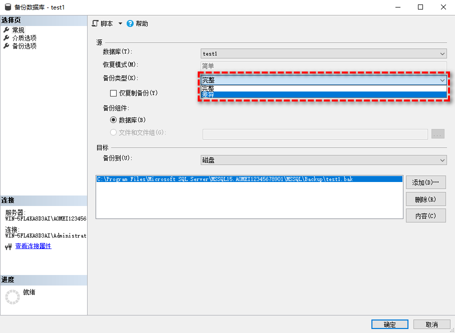但是SQLserver似乎并未提供的有直接的增量备份功能,比如在SSMS中的备份数据库选项中,只有完整备份和差异备份选项,并没有增量备份选项。并且常用的T-SQL命令中,也没有直接提供增量备份方式,只有一个DIFFERENTIAL命令用以备份自上次备份后发生变化的数据,我们可以将其视作增量备份使用。