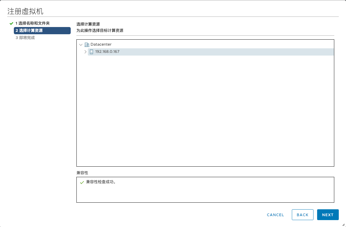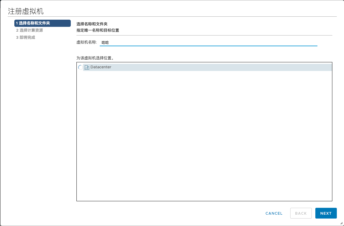 3. 在弹出窗口中,为要注册的 VM提供“名称和位置。”单击“下一步”继续。