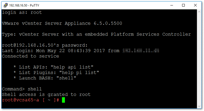 步骤2. 以root用户身份在设备上启动SSH会话。在提示符中输入shell或shell.set–enabled true以访问BASH。建立到VCSA的SSH连接,以root用户身份登录。