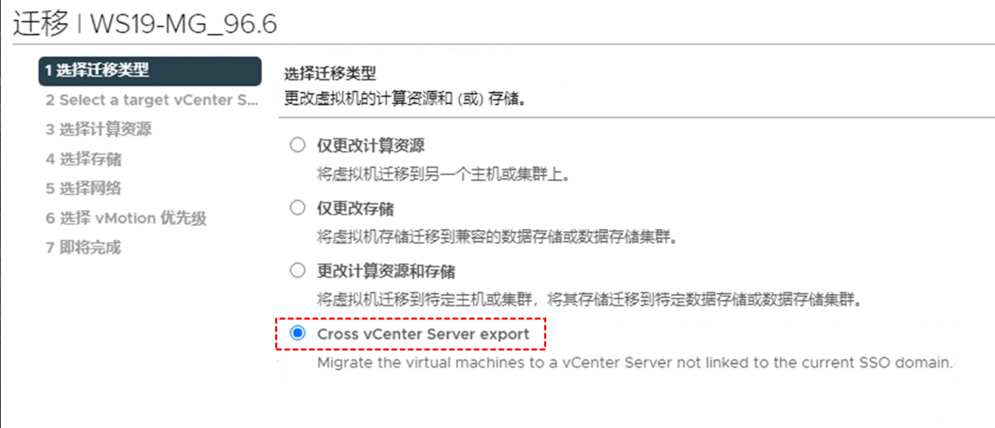 2. 会弹出一个向导。在选择迁移类型页面上,选择“Cross vCenter Server export”选项,然后单击“下一步”继续。