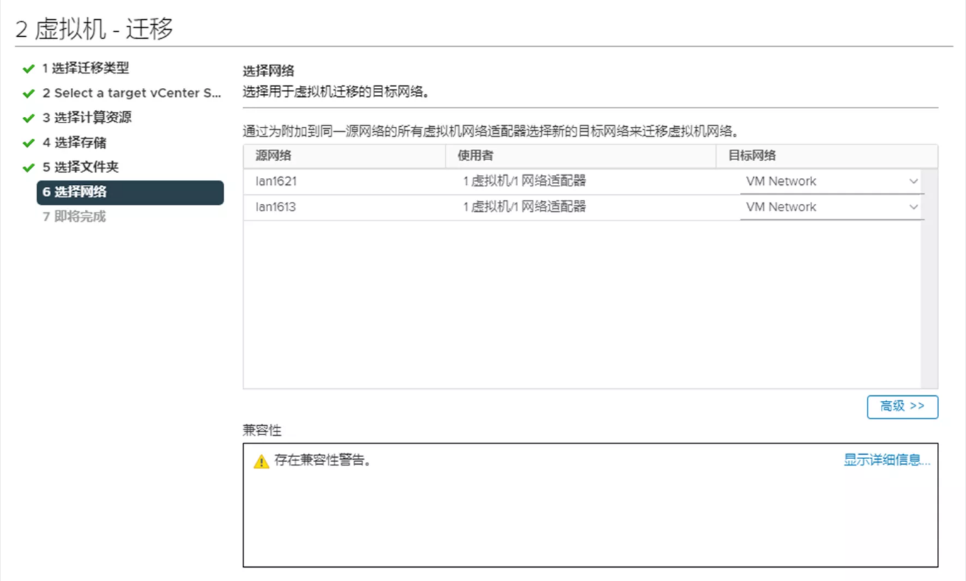7. 在“选择网络”页面上,选择虚拟机迁移的目标网络。