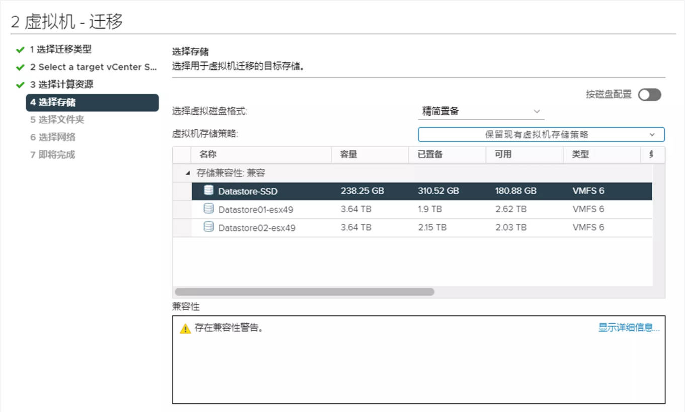 5. 在“选择存储”页面,选择虚拟机迁移的目标存储。
