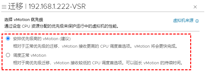 8. 在“选择vMotion优先级”页面上,提供了2个选项,通过优先分配CPU资源在vCenter实时迁移时来保护正在运行的虚拟机的性能。