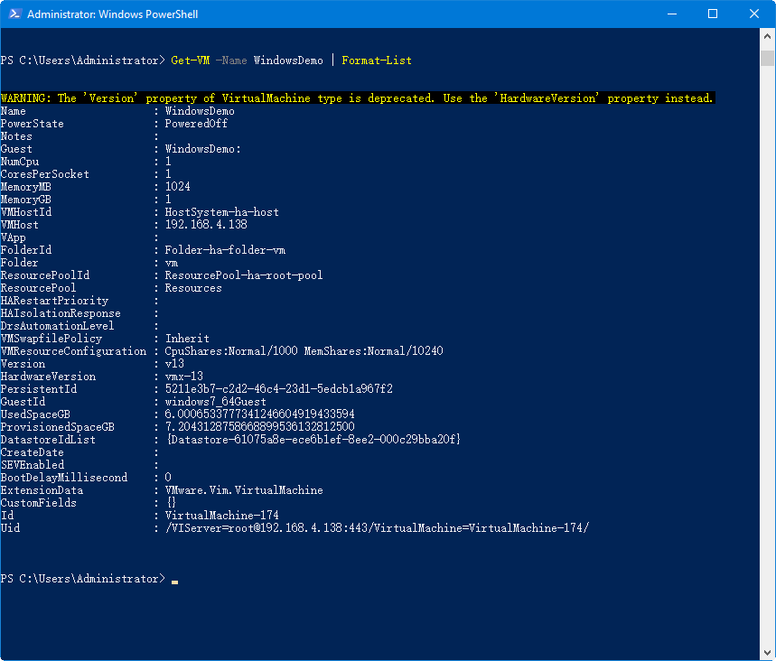 如您所见,默认情况下,此命令仅检索Name、PowerState、NumCPU和MemoryGB属性。