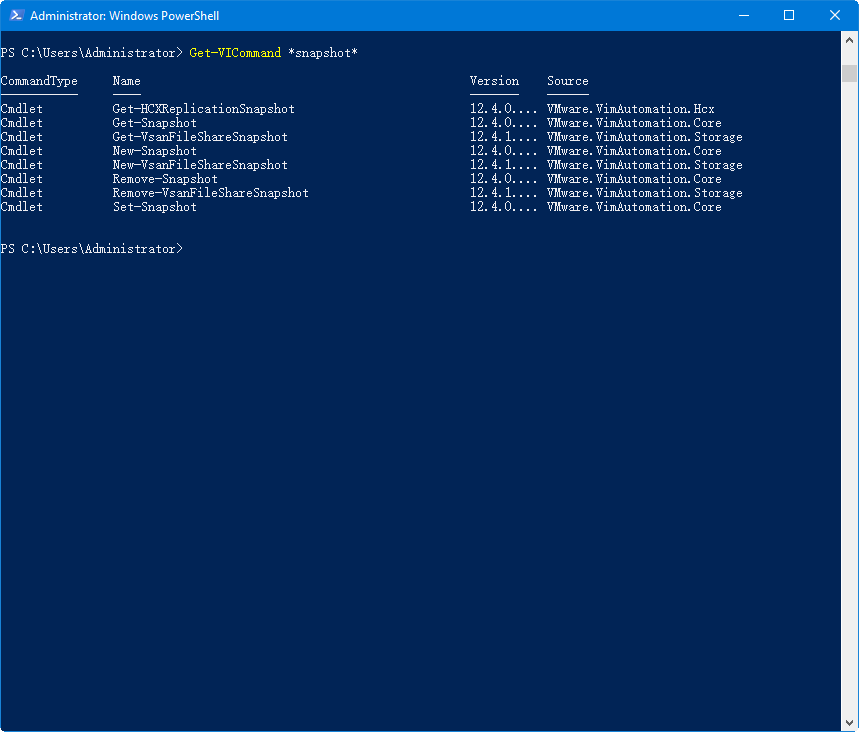 如果您不确定应该使用什么VMware PowerCLI命令来完成您的工作,那么Get command是检索模块的所有相关命令(包括cmdlet、别名和函数)的一种方便方法: