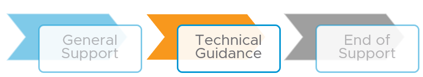 技术指导(如有)从一般支助阶段结束时起提供,持续时间固定。在产品处于技术指导阶段的情况下,可用的支持服务会减少。在技术指导阶段,除非另有说明,否则VMware不提供新的硬件支持、服务器/客户端/来宾操作系统更新、新的安全修补程序或错误修复。